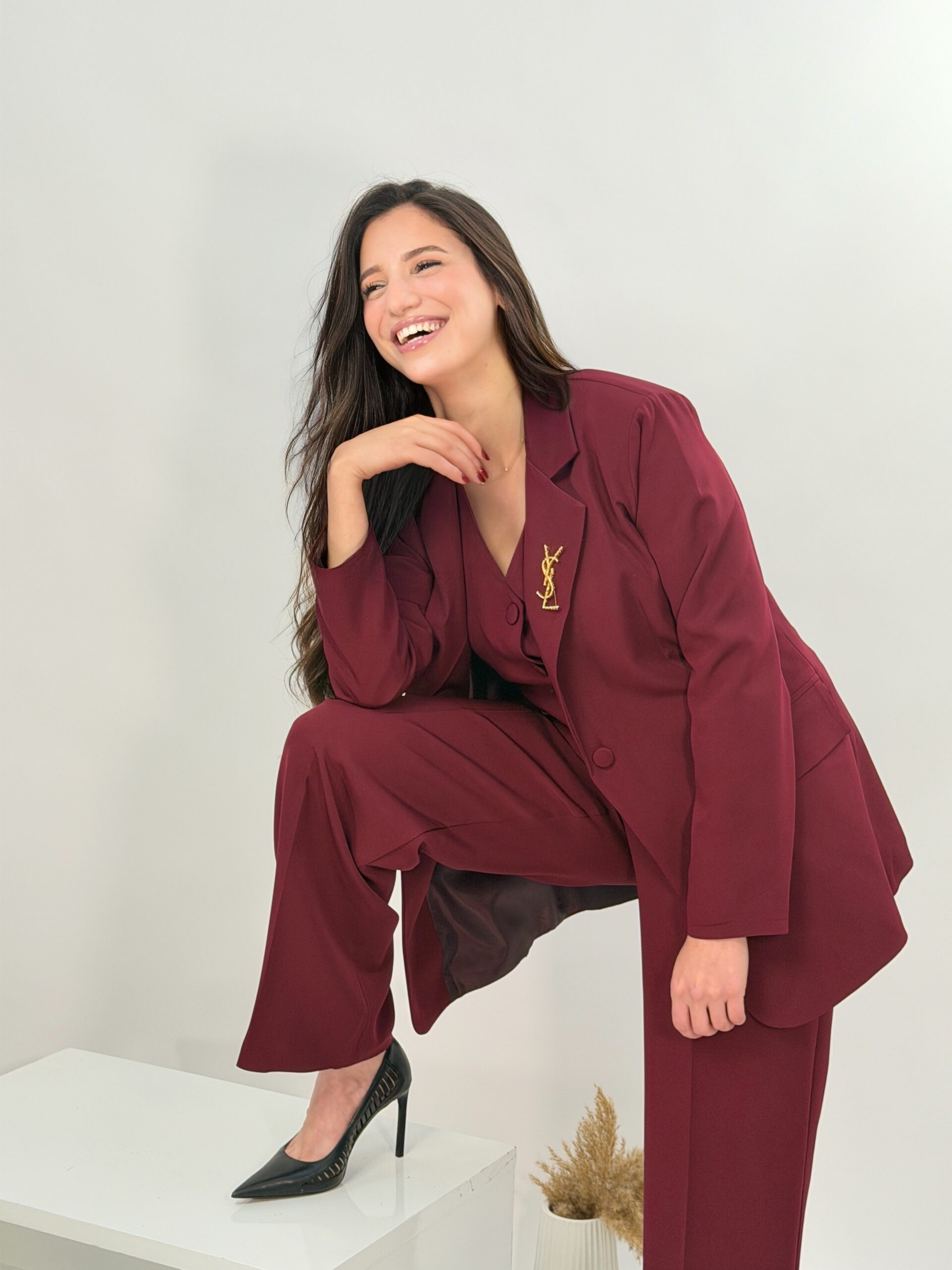 Composé de trois éléments parfaitement coordonnés, il offre une silhouette structurée, moderne et sophistiquée.