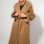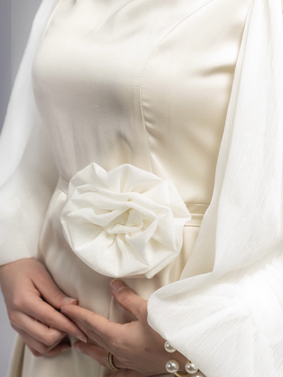 Ses manches bouffantes en voile léger apportent une touche aérienne et sophistiquée, tandis que la ceinture fine souligne délicatement la taille. Le détail floral à la taille ajoute une note romantique et chic, parfaitement assortie aux accessoires perlés.